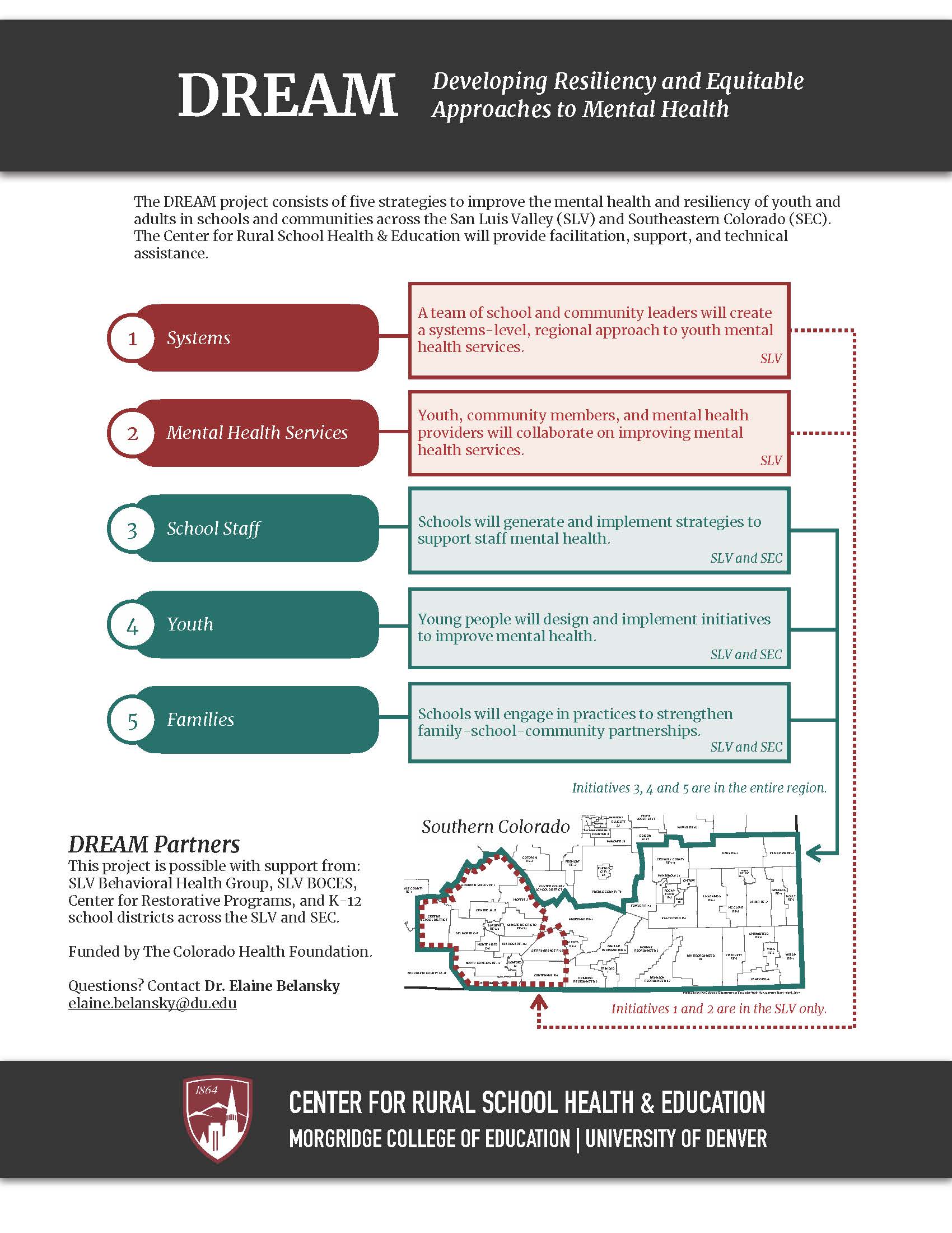 DREAM is an equity-focused project designed to promote the mental health of rural educators, students and families. The purpose of the five initiatives are to (1) promote the coordination of mental health systems for schools; (2) ensure clinical mental health practices are culturally responsive; (3) support the mental health of school staff; (4) engage youth in developing their own mental health initiatives; and (5) explore and strengthen family-school partnerships to promote mental health.